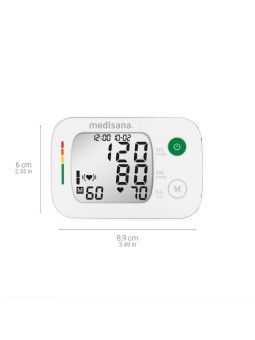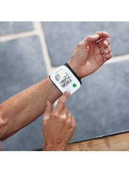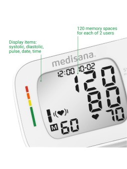 Mesure précise de la pression artérielle au poignet · Avec indicateur de battement de cœur irrégulier · 120 emplacements de mémoire pour chacun des 2 utilisateurs · Chiffres très grands pour une lecture facile · Design ultra-mince · Affichage des éléments : systolique, diastolique, pouls, date,...