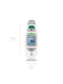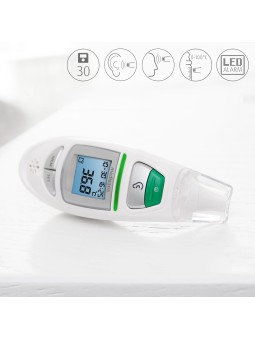 Thermomètre multifonctionnel infrarouge Mesure précise de la température corporelle dans l'oreille et sur le front en quelques secondes. Fonction supplémentaire, mesure de la température ambiante, des liquides et des surfaces (de 0 à 100°C). · Stockage automatique des 30 dernières mesures ·...