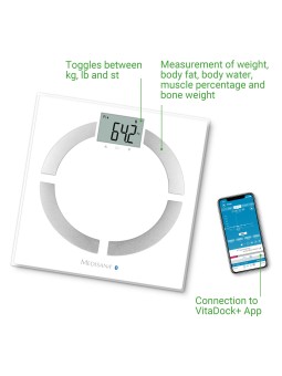 Balance d'analyse corporelle avec WiFi et Bluetooth · Transfert de données pratique via WiFi ou Bluetooth vers l'application VitaDock+ pour iOS et Android, et vers VitaDock® Online* · Mesure du poids, de la masse grasse, de la masse hydrique, de la masse musculaire et de la masse osseuse · Mesure...
