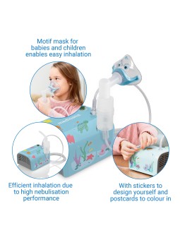 IN 155 - Inhalateur · Nébulisation avec technologie à air comprimé · Soulagement fiable des troubles respiratoires Inhalation efficace grâce à des performances de nébulisation élevées (env. 0,35 ml/min.) · Comprend des lisseurs pour un design individuel et des cartes à colorier · Le masque à...