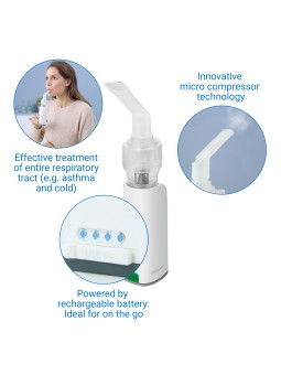 Batterie rechargeable : idéale pour les déplacements L’inhalateur · Haute efficacité grâce à la technologie innovante des micro-compresseurs · Pour le traitement ciblé des maladies des voies respiratoires supérieures et inférieures (par exemple l'asthme et le rhume) · Alimenté par batterie...