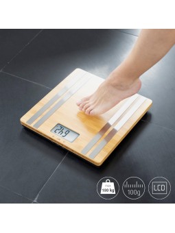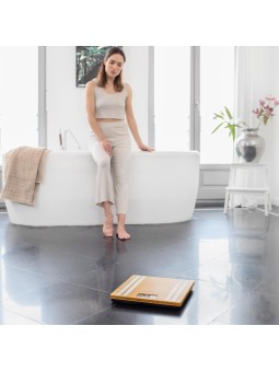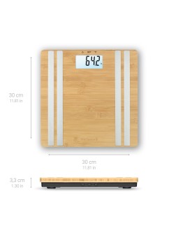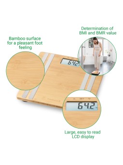 Balance d'analyse corporelle en bambou · Balance d'analyse corporelle avec une surface en bambou de haute qualité pour une sensation agréable sous les pieds · Mesure du poids, de la graisse corporelle, de l'eau corporelle, du pourcentage de muscle et du poids osseux · Transfert de données...