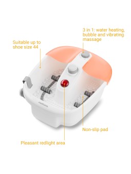 Avec une agréable lumière rouge - 3-en-1 : Chauffage de l'eau, bulles et massage vibrant • Rouleaux de massage pour un massage réflexologique des pieds • Semelle intérieure favorisant le massage des pieds • Fonction de massage à sec • Pieds en caoutchouc antidérapants • Protection...