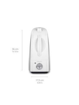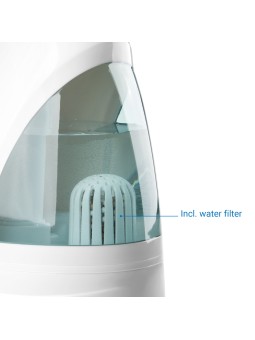 Humidificateur d'air avec technologie à ultrasons pour améliorer la qualité de l'air respirable · Haute efficacité grâce à une atomisation microfine · Niveaux de brumisation réglables en continu · Réservoir amovible · Arrêt automatique lorsque le réservoir est vide · Faible bruit et économie...